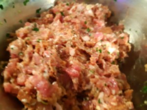 Essorez le pain et mélangez-le avec la chair à saucisse (il n’y a qu’à presser sur le boyau pour la faire sortir), le hachis d’ail et persil, l’œuf, salez et poivrez (ou ajoutez le piment d’Espelette).
